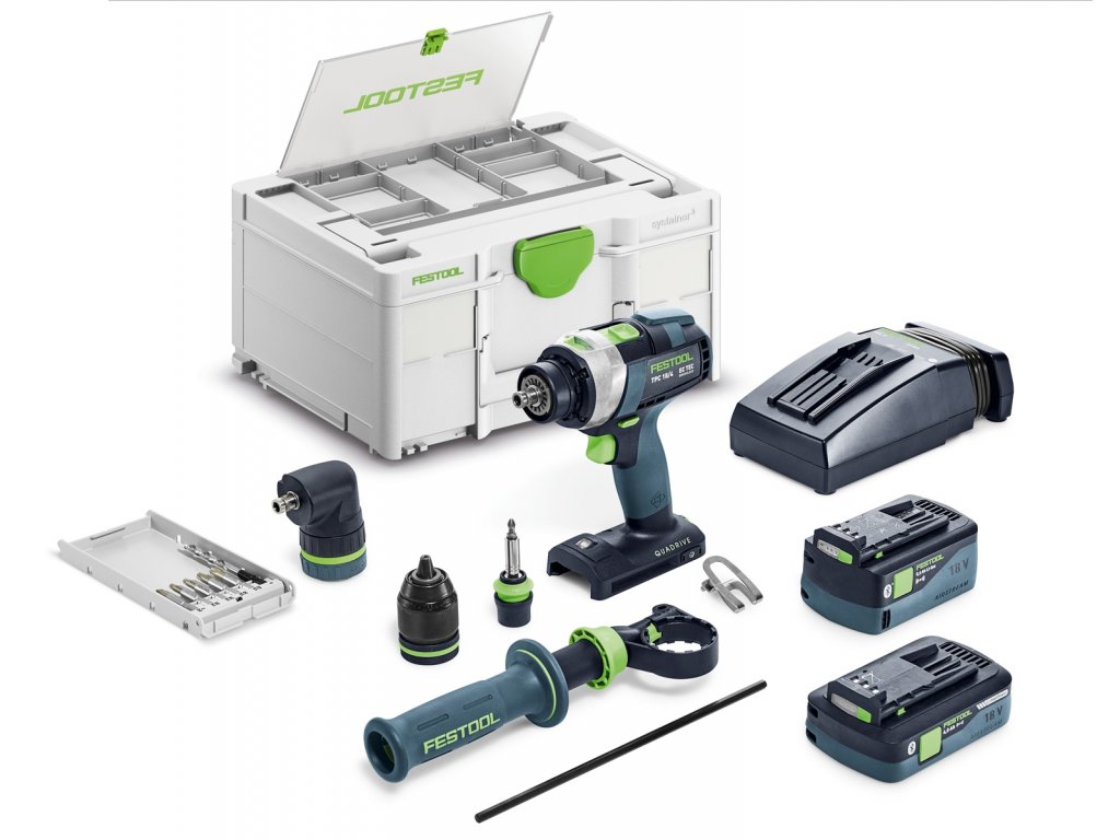 akumulátor BP 18 Li 4,0 HPC-ASI, akumulátor BP 18 Li 5,0 ASI, rychlonabíječka TCL 6, sklíčidlo CENTROTEC, magnetický držák bitů CENTROTEC BH 60 CE-Imp, rychloupínací sklíčidlo FastFix 13 mm KC 13-1/2-MMFP, přídavná rukojeť, úhlový nástavec FastFix, bit PZ 2, kazeta s bity BKS SYS3 D6 PZ TX 50 CE, spona na opasek, Systainer SYS3 DF M 187