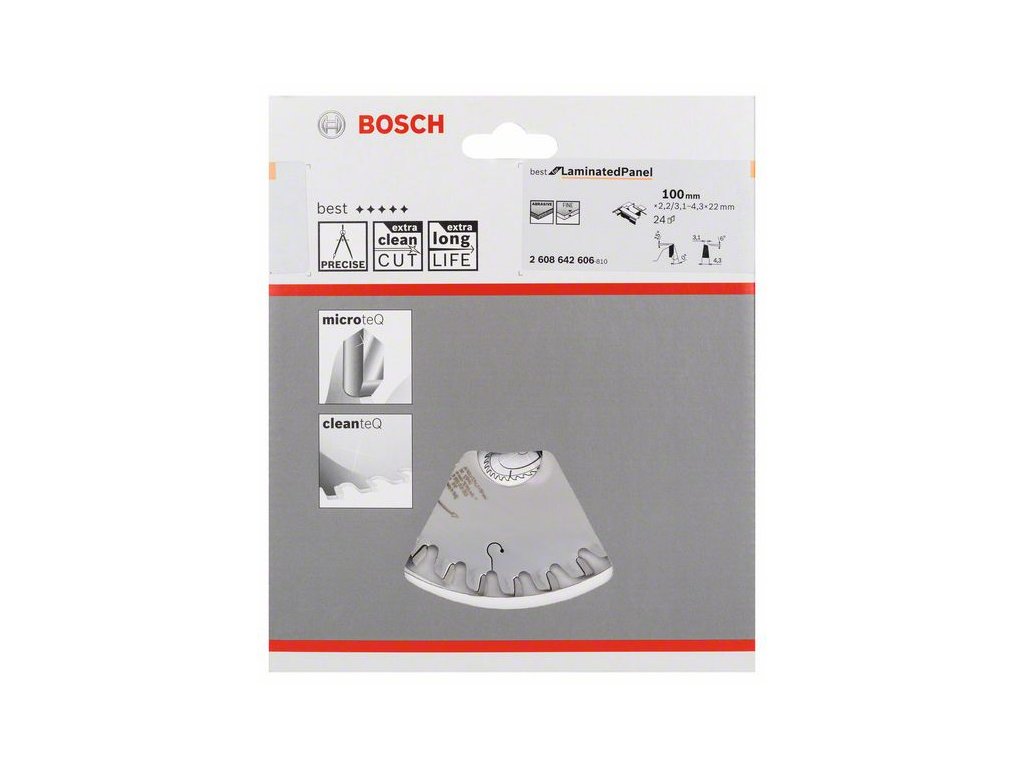 Kónický předřezový kotouč Best for Laminated Panel nabízí průmyslovou kvalitu a přesnost při vysoce náročném řezání laminovaných desek s vrchním materiálem z jedné nebo obou stran. Výkony a kvalitu předřezového kotouče posilují unikátní mimořádně tvrdé zuby z materiálu Microteq, který vyrábí přímo společnost Bosch z velmi trvanlivých karbidových zrn. Povlak Cleanteq, kterým je kotouč opatřen, snižuje adhezi například pryskyřice a lepidel, což zajišťuje mimořádně čisté řezy a současně brání korozi a kotouč chladí. Tento kónický předřezový kotouč je určen k řezání dřevotřísky, deskových materiálů a dýhou laminovaných materiálů. Výrobek se vyznačuje geometrií zubu ATB-Con (Alternate Top Bevel na kónickém předřezovém kotouči), která zajišťuje čisté řezy všech druhů dřevěných materiálů a laminovaných desek.