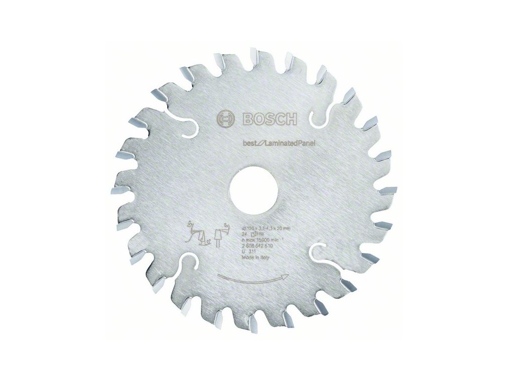 Kónický předřezový kotouč Best for Laminated Panel nabízí průmyslovou kvalitu a přesnost při vysoce náročném řezání laminovaných desek s vrchním materiálem z jedné nebo obou stran. Výkony a kvalitu předřezového kotouče posilují unikátní mimořádně tvrdé zuby z materiálu Microteq, který vyrábí přímo společnost Bosch z velmi trvanlivých karbidových zrn. Povlak Cleanteq, kterým je kotouč opatřen, snižuje adhezi například pryskyřice a lepidel, což zajišťuje mimořádně čisté řezy a současně brání korozi a kotouč chladí. Tento kónický předřezový kotouč je určen k řezání dřevotřísky, deskových materiálů a dýhou laminovaných materiálů. Výrobek se vyznačuje geometrií zubu ATB-Con (Alternate Top Bevel na kónickém předřezovém kotouči), která zajišťuje čisté řezy všech druhů dřevěných materiálů a laminovaných desek.