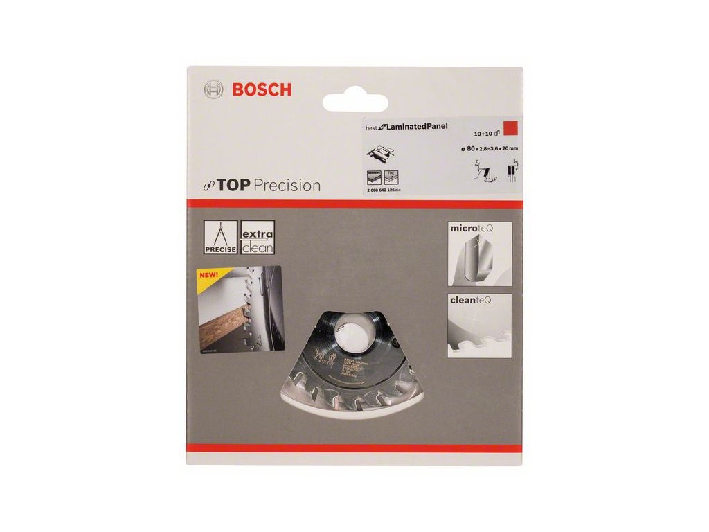 Předřezový kotouč Top Precision Best for Laminated Panel nabízí průmyslovou kvalitu a přesnost při vysoce náročném řezání laminovaných desek s vrchním materiálem z jedné nebo obou stran. Výkony a kvalitu předřezového kotouče posilují unikátní mimořádně tvrdé zuby z materiálu Microteq, který vyrábí přímo společnost Bosch z velmi trvanlivých karbidových zrn. Povlak Cleanteq, kterým je kotouč opatřen, snižuje adhezi například pryskyřice a lepidel, což zajišťuje mimořádně čisté řezy a současně brání korozi a kotouč chladí. Tento nastavitelný předřezový kotouč je určen k řezání dřevotřísky, deskových materiálů a dýhou laminovaných materiálů. Předřezový kotouč Top Precision Best for Laminated Panel se vyznačuje geometrií zubu ATB (Alternate Top Bevel), která zajišťuje čisté řezy všech druhů dřevěných materiálů a laminovaných desek.