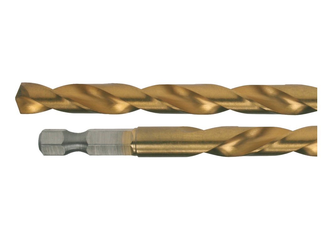 Vrták HSS-TIN dle DIN 338 s úhlem špičky 135°. S 1/4" šestihranným pohonem (DIN 3126). Vhodné pro vrtání v nelegované a legované oceli, mědi, bronzu a tvrdých plastech. Pro použití rovněž v rázových utahovácích s příslušným uchycením nástroje.