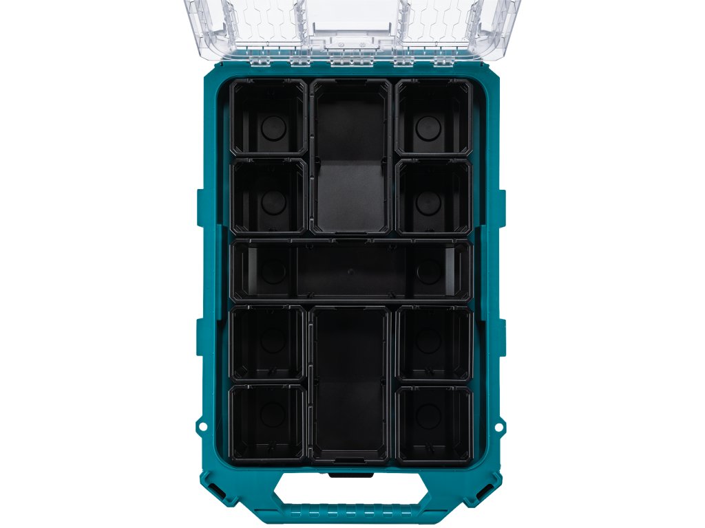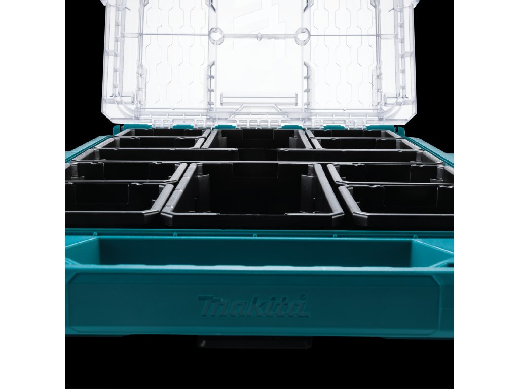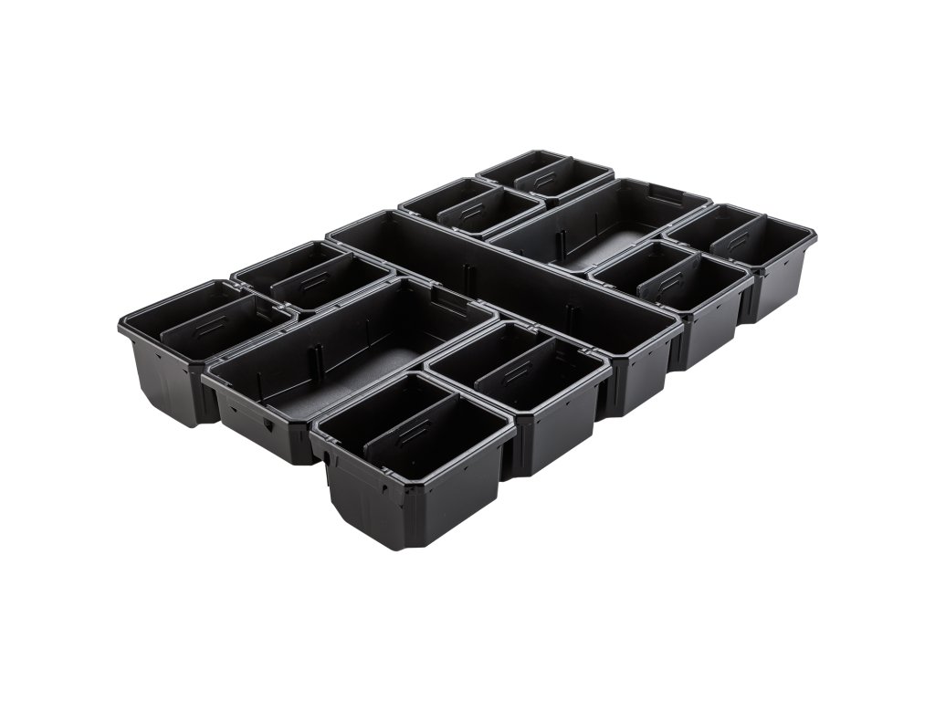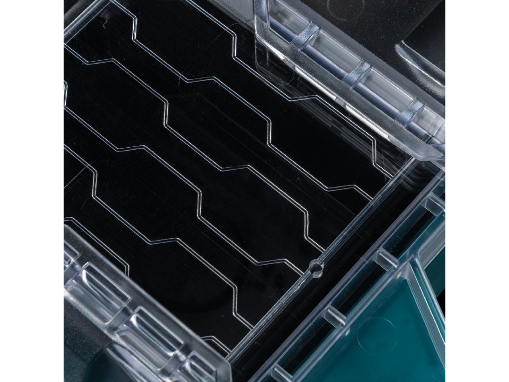 - Má různé velikosti zásobníků pro uspořádání malých i velkých dílů, s nízkoprofilovým designem pro organizaci malých dílů.