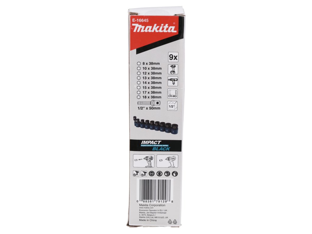 Sada rázových nástrčných klíčů 1/2" v rozměrech 8, 10, 12, 13, 14, 15, 17, 18 mm. Délka 38 mm