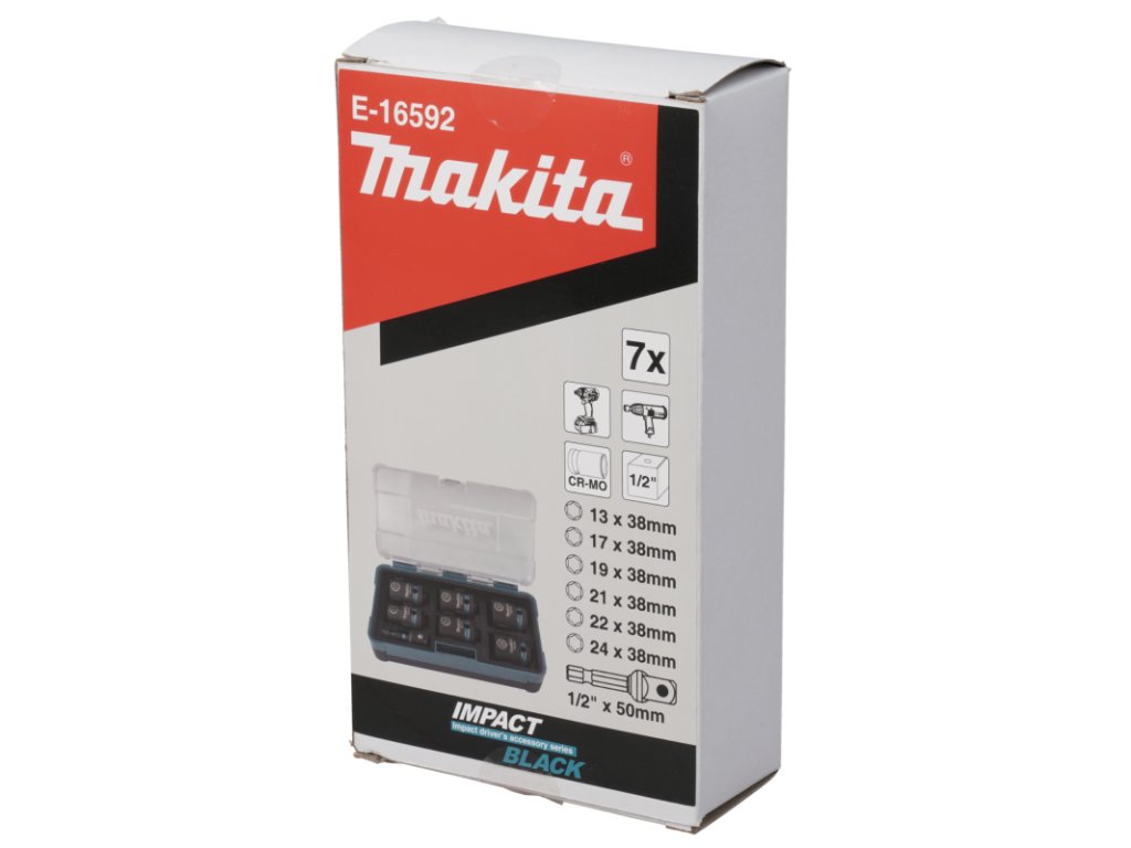 Sada nástrčných torzních klíčů 1/2" Impact Black 7ks obsahuje 6x šestihranné hlavice 13, 17, 19, 21, 22, 24 mm v délce 38 mm, 1x adaptér 1/4" bit na 1/2" čtyřhran, Materiál: CrMo - ChromMolybdenová ocel.