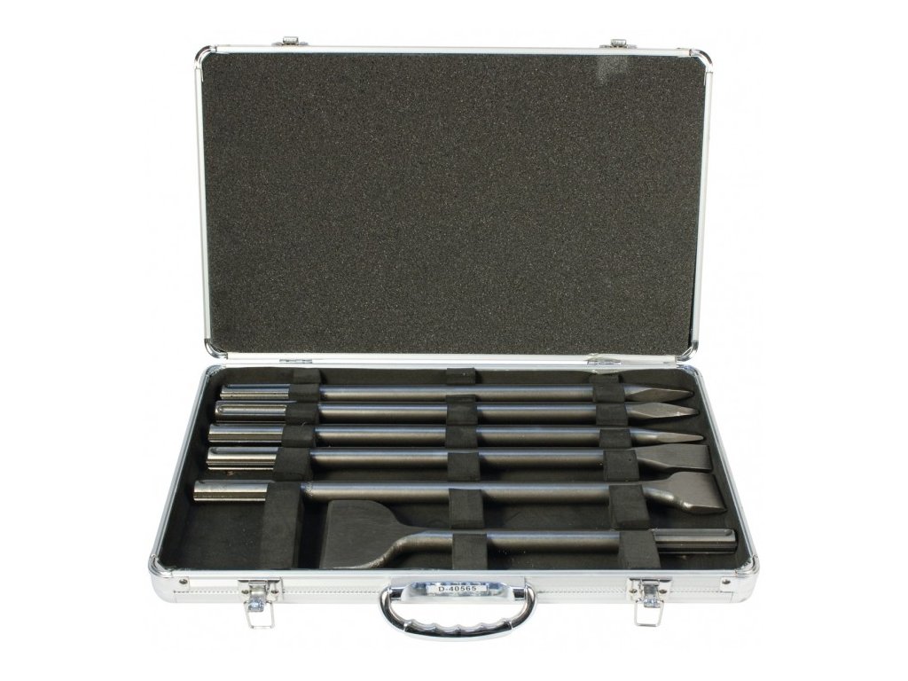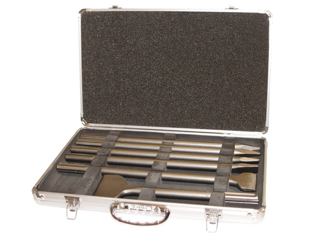 Sada sekáčů a špičáků SDS-Max 6 ks (400 mm: 2 x špičák, 2 x plochý 25 mm, 1 x plochý 50 mm, 1 x plochý 300 x 80 mm). Dodáváno v hliníkovém kufru.