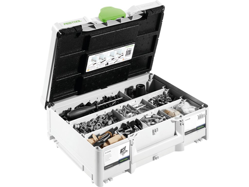 svorník pro korpusy DOMINO/DOMINO KV D8, svorník pro korpusy DOMINO/LR32 KV-LR32 D8, středový svorník DOMINO/DOMINO MSV D8, středový svorník DOMINO/LR32 MSV-LR32 D8, 50 světle hnědých krytek KV-AK D15 brn, 50 stříbrných krytek KV-AK D15 slr, 50 bílých krytek KV-AK D15 wht, 50 šedých krytek KV-AK D15 gr, DOMINO D 8 x 36 mm, vrtací šablona BS-KV D15, vrták na kování KVB-HW D15 CE, šroubovák, Systainer SYS3 M 137, v kartonu